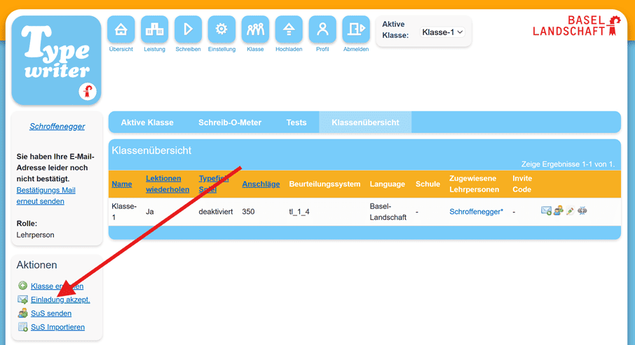 Die einzuladende Lehrperson loggt sich selbst als Lehrperson ein und wechselt ebenfalls über das Menü „Klasse“ in die „Klassenübersicht“. Dort wird links bei den Aktionen der Punkt “Einladung akzeptieren” angezeigt.