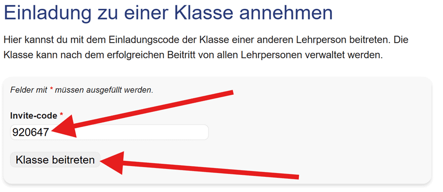 Geben Sie anschließend den erhaltenen Code ein und klicken Sie auf “Klasse beitreten”.