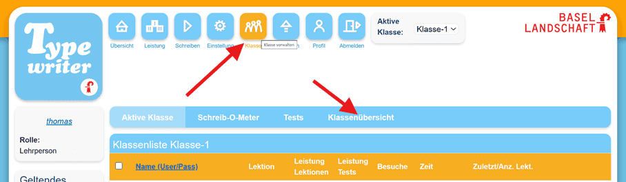 Nach dem Login klicken Sie auf die „Klassenverwaltung“ und anschließend auf das Untermenü „Klassenübersicht“.